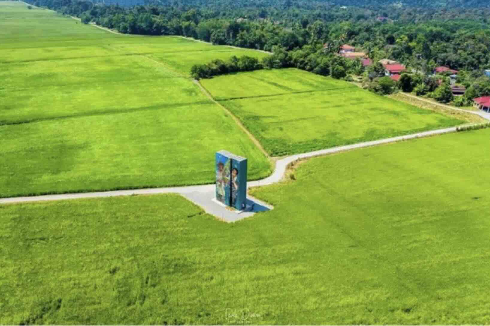 Admire striking outdoor mural installations—industrial shipping containers transformed into canvases—rising from the green rice paddies.